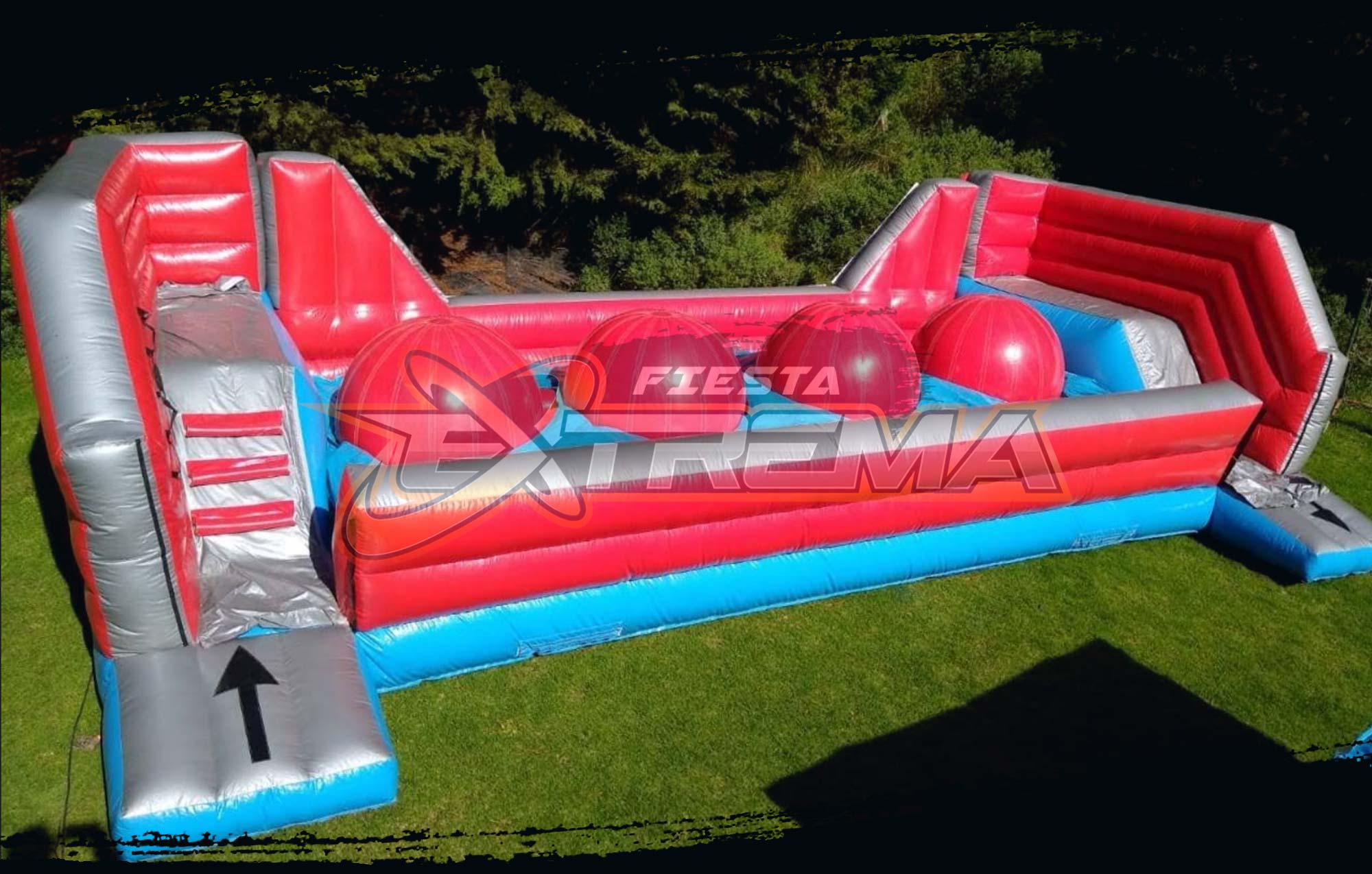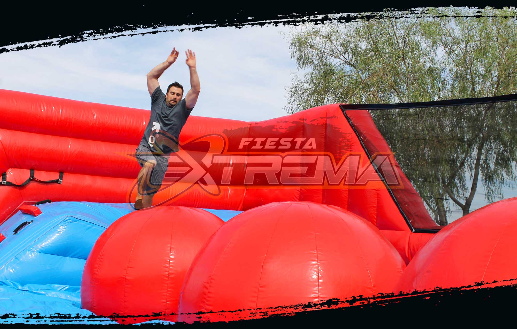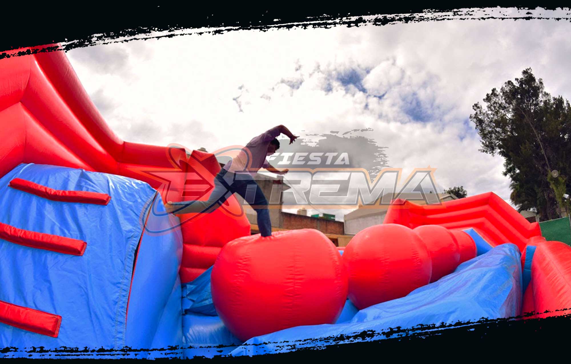 Circuito de juegos inflables tiene una serie de 4 pelotas gigantes en las que tus invitados deberán saltar y rebotar para tratar de llegar al otro lado en este juego estilo Resbalón.